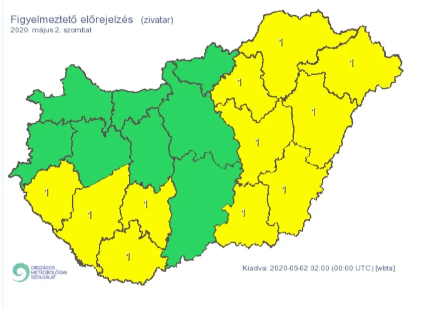 Az Országos Meteorológiai szolgálat több megyére is elsőfokú figyelmeztetést adott ki a zivatarok miatt.