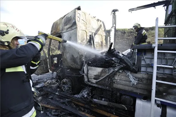 A katasztrófavédelem tájékoztatása szerint egy pótkocsis teherautó égett az autóút M1-es autópálya felé vezető oldalán, a tűzoltók két vízsugárral eloltották a lángokat.