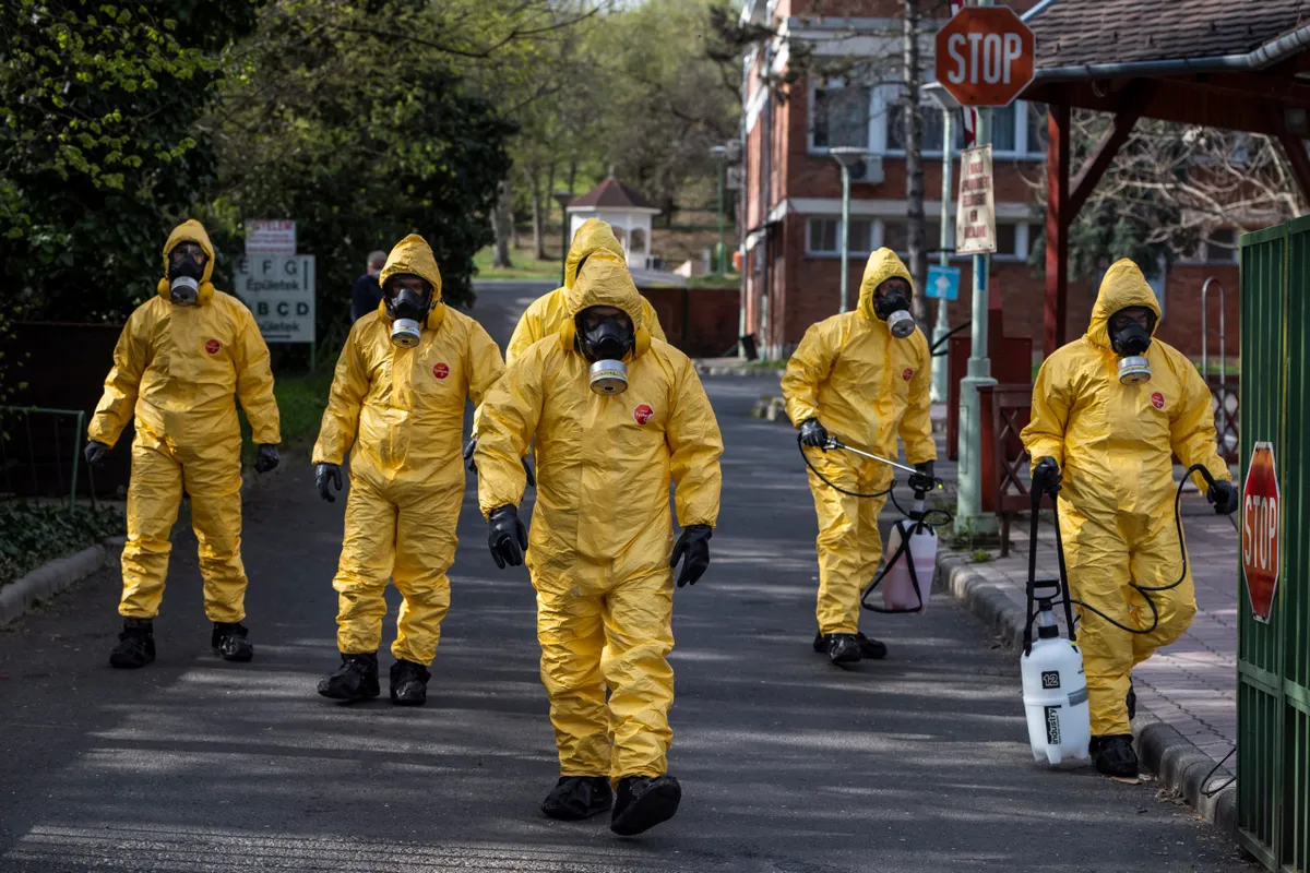 Fertõtlenítéshez védõruhába öltözött katonák a fõvárosi önkormányzat Pesti úti idõsotthonában 2020. április 12-én. Az intézményben eddig összesen 198 igazolt koronavírus-fertõzöttet találtak, nyolcan meghaltak.