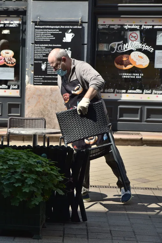 Alig tette ki a Ráday utcában tegnap reggel az első székeket Rflum Robert, a Fánkterápia üzletvezetője, Zubonyainé Pelka Zsuzsa és Gollenyák Gabriella lecsapott rájuk: az első vendégek voltak a járvány utáni fővárosi nyitáskor. A vidéki nyitásról még korábban számolt be lapunk.