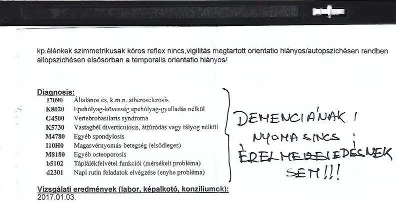 Aztán miután visszavitték a Pesti útra és az otthonban elhunyt, készítettek egy halottvizsgálati jegyzőkönyvet amibe minden alap nélkül azt írták: 10 éve demenciában szenvedett és 20 éve érelmeszesedése volt.
