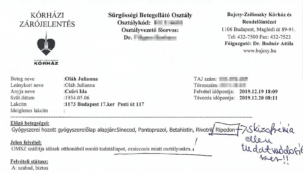A kórházi zárójelentésből feketén-fehéren kiderül, Julika néni egyáltalán nem szorult pszichiátriai gyógyszerekre, biztosan nem szenvedett demenciában, és nem volt érelmeszesedése sem. Ennek ellenére a Pesti úti otthonban a legdurvább pszichiátriai gyógyszerekkel tömték teli. Ráadásul a kórházban Julika néninél is a súlyos kiszáradás jeleit rögzítették és dokumentumok igazolják egy állítólagos elesés külsérelmi nyomait is.