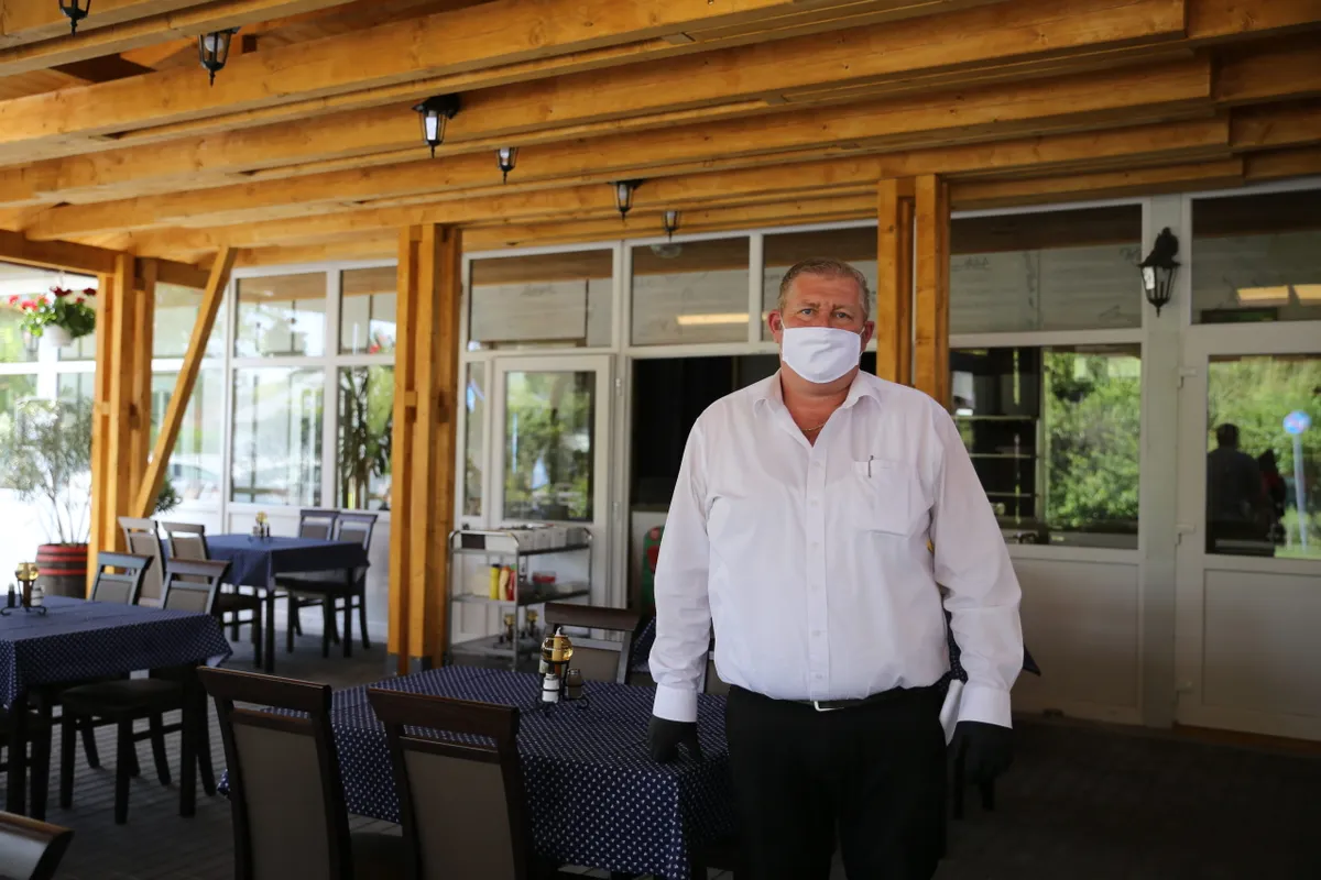 A pincérek maszkban, kesztyűben szolgálnak ki a gárdonyi Fehér Fregatt teraszán, de örülnek, hogy újra dolgozhatnak.