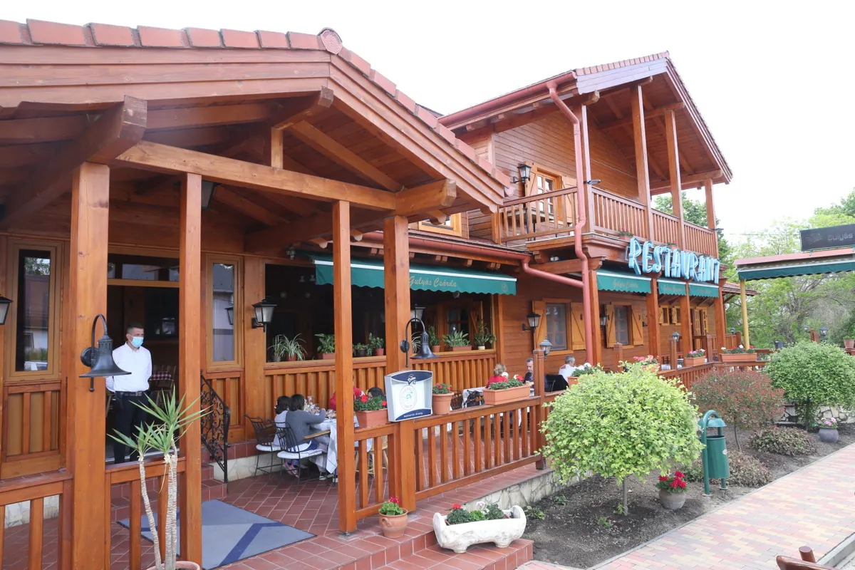 Agárd, Gulyás Csárda: „Roham volt, visszatért sok régi ismerős vendég” A csárdában már délben több vendég is volt, ebédeltek, kávézgattak. Mátyási László főpincér elmondta: náluk nem jött be az elviteles ételszállítás, ezért inkább felújították az éttermet, és őket is meglepte, hogy nyitáskor a vendégek megrohamozták őket, sok régi ismerőst üdvözölhettek. Fotó: Ripost „Előny a gyors reagálás, erre készültünk” – szögezte le. „Szerencsére nagy a kerthelyiségünk és az egyik belső helyiséget is kerthelyiséggé tudtuk alakítani. A távolságtartás miatt kevesebb asztalt tudunk kitenni, így kevesebb vendéget tudunk fogadni, de nem emeltünk árat, mert szeretnénk visszacsábítani a vendégeinket.”