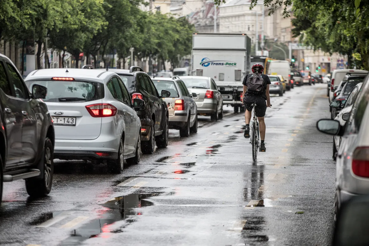 A szakadó esőben még többen döntöttek úgy a fővárosban, hogy autóba szállnak – kár volt. A teljesen üres kerékpársávok mellett dugóban tölthették az idejüket...