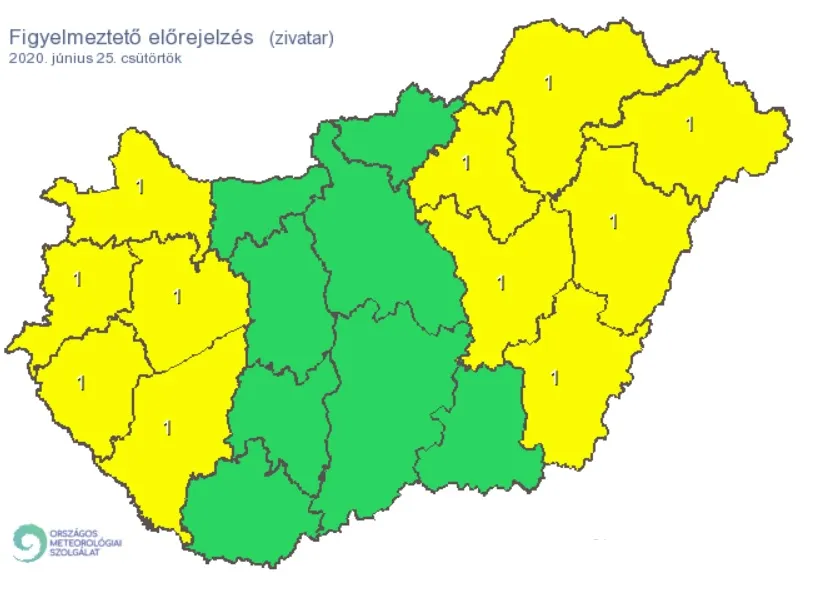 Tizenegy megyét érintő figyelmeztető előrejelzést adott ki az Országos Meteorológiai Szolgálat. Az ország két felén zivatarok alakulhatnak ki. Az elsődleges veszélyforrást a villámlás jelenti, esetenként szélerősödés és jégeső is előfordulhat.