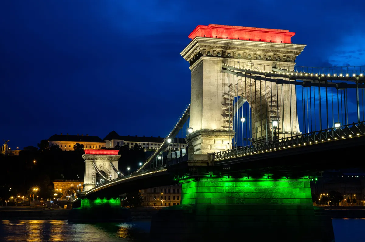 A nemzeti színû fényfestés Lánchídon az elsõ világháborút lezáró trianoni békeszerzõdés aláírásának 100. évfordulóján, a nemzeti összetartozás napján, 2020. június 4-én.