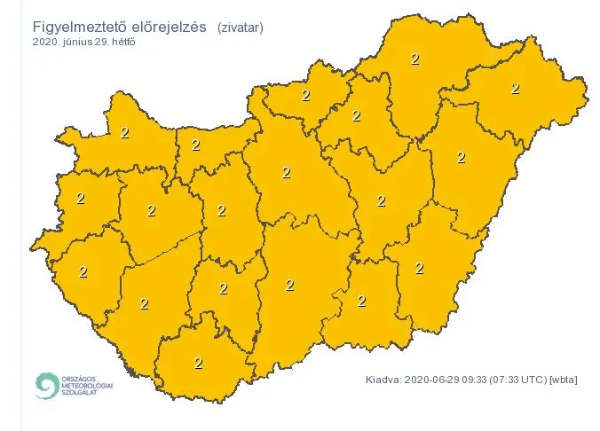 A teljes országra másodfokú, narancssárga riasztást adott ki az Országos Meteorológiai Szolgálat a heves zivatarok miatt.