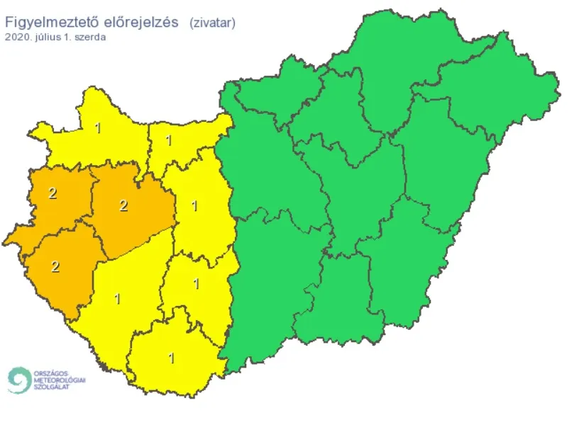 Szerdán leginkább az ország nyugati tájait fogja érinteni a rendkívüli időjárás. Kilenc megyére adott ki figyelmeztetést az Országos Meteorológiai Szolgálat.