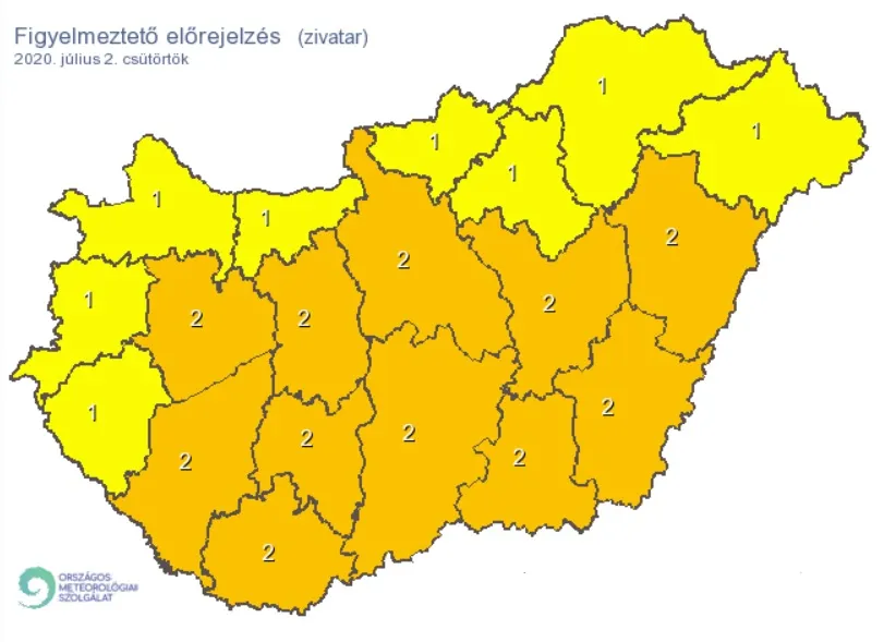 Csütörtökön napközben országszerte jó feltételek mutatkoznak intenzív zivatarok, helyenként felhőszakadás, jégeső kialakulásához.
