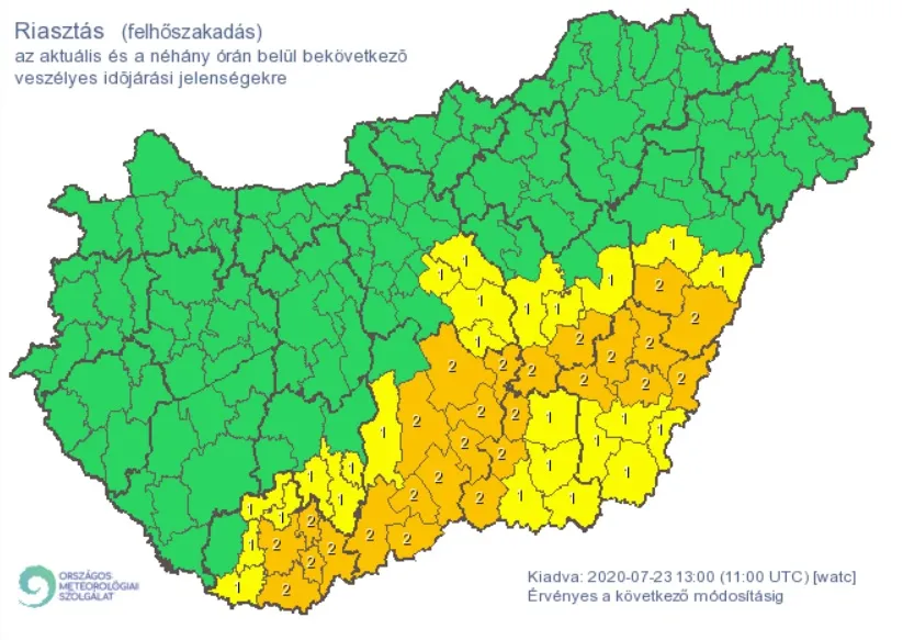 Emellett az egész országban a zivatarveszély miatt is elsőfokú figyelmeztetés van érvényben.