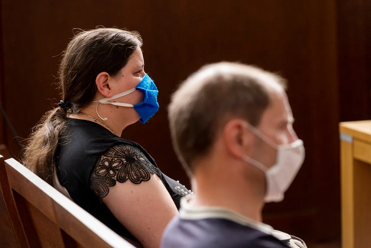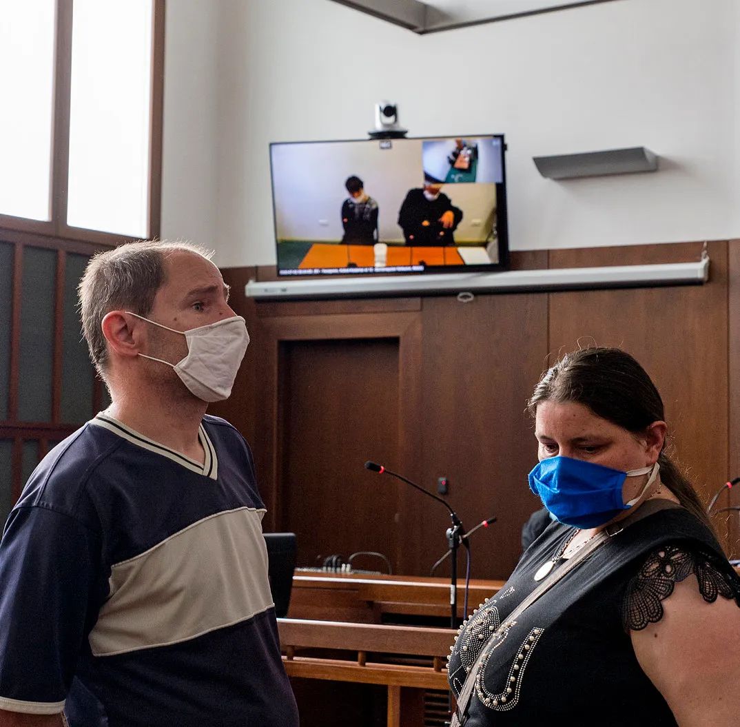 Horváth Gyõzõ és Farkas Zsanett, a sértett szülei az F. F. vádlott (a kivetítõn balra) ellen emberölés bûntette miatt indult büntetõper másodfokú tárgyalásán a Gyõri Ítélõtáblán 2020. június 2-án.