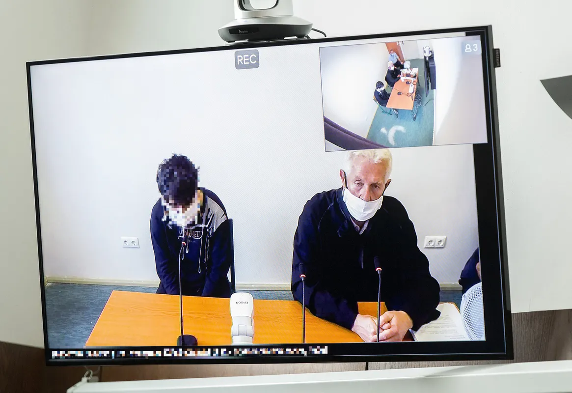 F. F. vádlott (a kivetítõn balra) az ellen emberölés bûntette miatt indult büntetõper másodfokú tárgyalásán a Gyõri Ítélõtáblán 2020. június 2-án.
