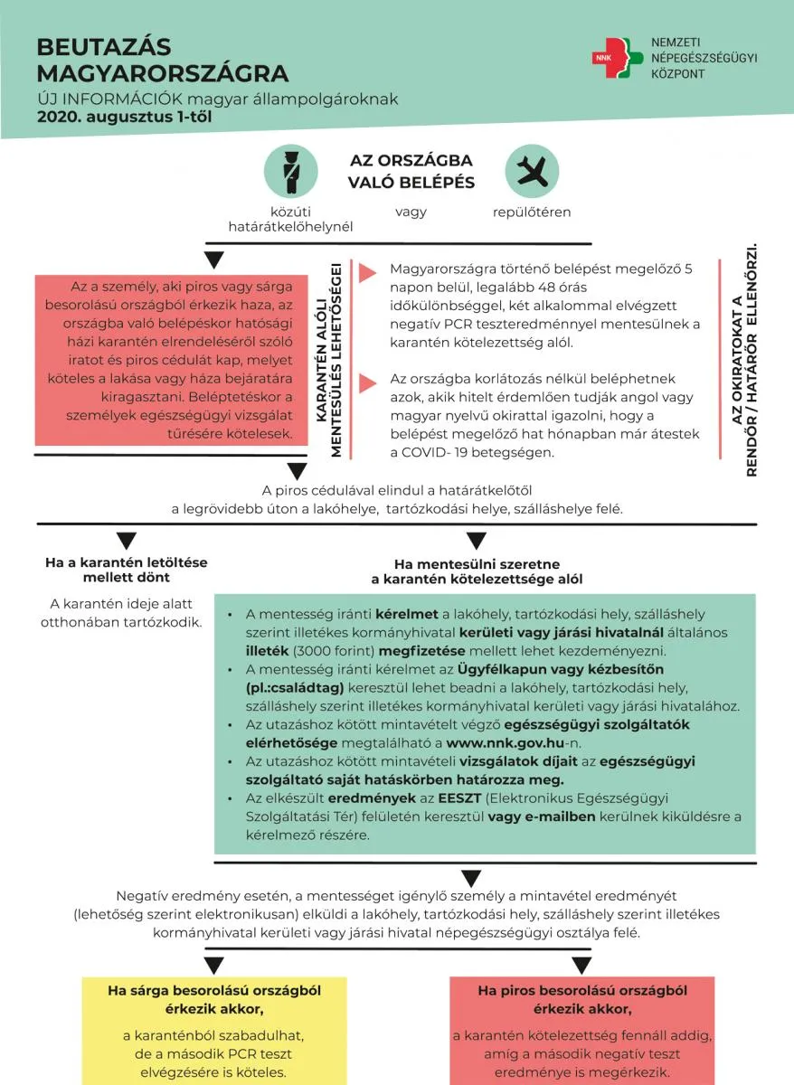 A Nemzeti Népegészségügyi Központ tájékoztatást adott arról, hogy augusztus 1-től milyen feltételekkel léphet be magyar állampolgár sárga és piros jelzésű országból, valamint mi a teendője akkor, ha az elrendelt hatósági házi karatén alól mentesülni szeretne.