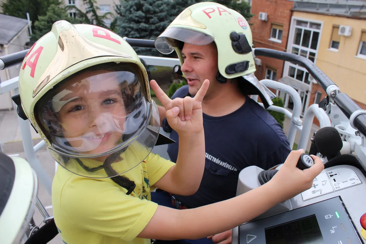 „Bence már többször látta a tűzoltókat, látásból ismeri őket, márciusra terveztük a látogatását, ám a Covid közbeszólt. Most viszont megkaptuk az engedélyt, a tűzoltók nagy örömmel és barátságosan fogadták Bencét, aki rendkívül élvezte a kalandot. Beöltözött bevetési ruhába, irányította a létraszert, beült az autókba, puttonyfecskendővel célbalövést gyakorolt kishúgával, aki elkísérte a kalandra. Azt reméljük, ezekből a különleges élményekből a gyerekek erőt merítenek a gyógyuláshoz.”