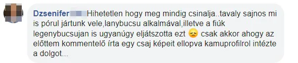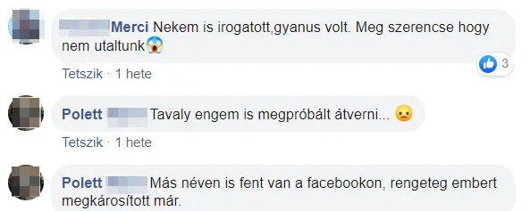 „Akkor bukkantam rá bejegyzésekre, amikben azt írják, hogy a profil tulajdonosa csaló. Több felhívást is találtam róla. Kértem, utalja vissza a pénzemet, de csak ígérgetett, arra hivatkozva, hogy nem ér rá. 19800 forintom bánja, hogy hittem neki„ – mondta a Ripost-nak Emese. „Miután ragaszkodtam hozzá, hogy azonnal küldje vissza a pénzem, felszívódott. Feljelentést tettem, azt mondták, megpróbálják lenyomozni a bankszámla adatai alapján.”