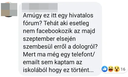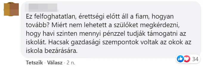 „Kedden reggel kisírt szemmel jött oda hozzám a lányom, hogy megszűnik az iskola. Nem akartam elhinni, azt mondtam neki, hogy ez valami álhír. Mellbe vágott, mikor rájöttem, hogy nem az. Mi lesz ezután? Hogy fog leérettségizni? Pánikba estünk. Sikerült azóta elintézni, hogy felvegyék esti tagozatra, már csak ott volt hely. Szétesik az osztályuk, így telik majd az utolsó évük. Úgy érzem, cserben hagytak bennünket, döbbenetes ez az egész helyzet!”