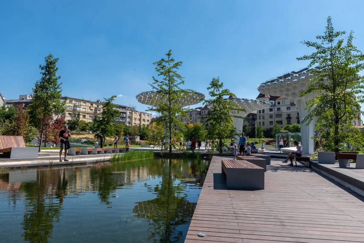 Panorámalifttel ellátott függőkert, napelemfák, hűsítő szökőkút, napágyak és egyebek mellett egy kristálytiszta vízű tó várja a budapesti Széllkapu Parkban a látogatókat. Már egy nappal az átadás után mosolygósan sétálgattak itt kisgyermekes családok, idős emberek.