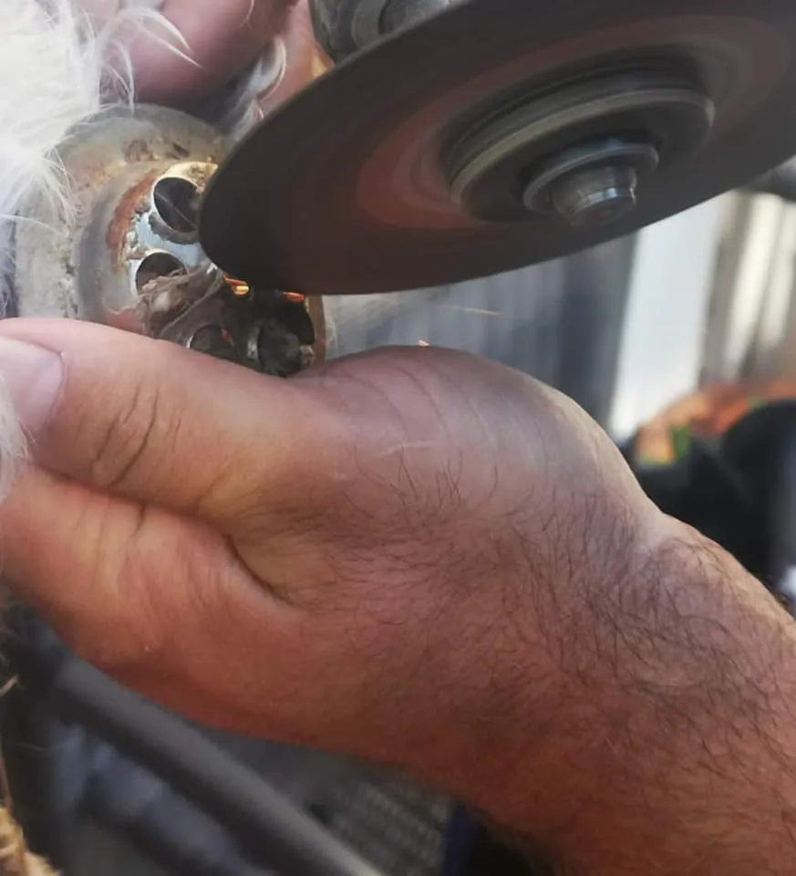 Alulról elbontották a kádat, és a komplett csővel együtt vették ki a kutyát. A középen lévő, régi csavarral meggyűlt a bajuk, ám egy erősebb csavarhúzóval az is lekerült. Végül egy akkumulátoros flexszel elkezdték milliméterenként haladva levágni az állat lábáról a karikát, eközben letakarták a lábát egy fém védővel, hogy a szikrák miatt ne legyen probléma.