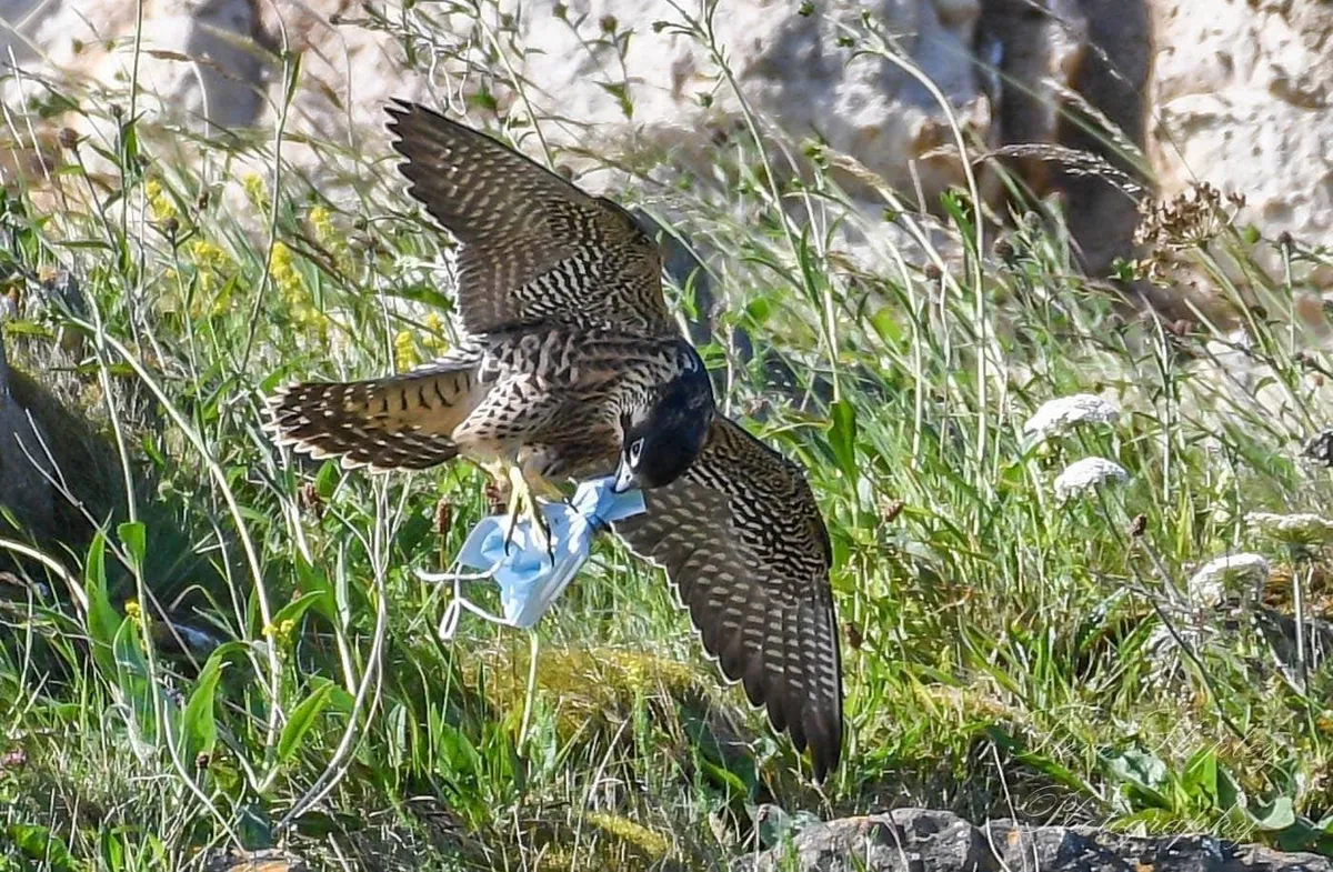 Angliában pedig egy vándorsólyom csőrébe szorult a maszk.