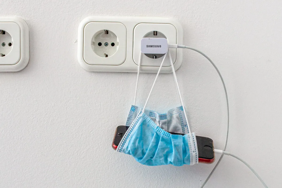 Fotó: RipostJól jöhet a még nem használt szájmaszk, ha a mobiltöltéshez kinézett konnektor olyan helyen van, hogy nem ér el a töltőkábel az asztalig, amire a készléket tettük. Ilyenkor a bedugott töltő csatlakozójának tetejére illesszük a szájmaszk két gumiját, a maszkba pedig beletehetjük az okostelefont.
