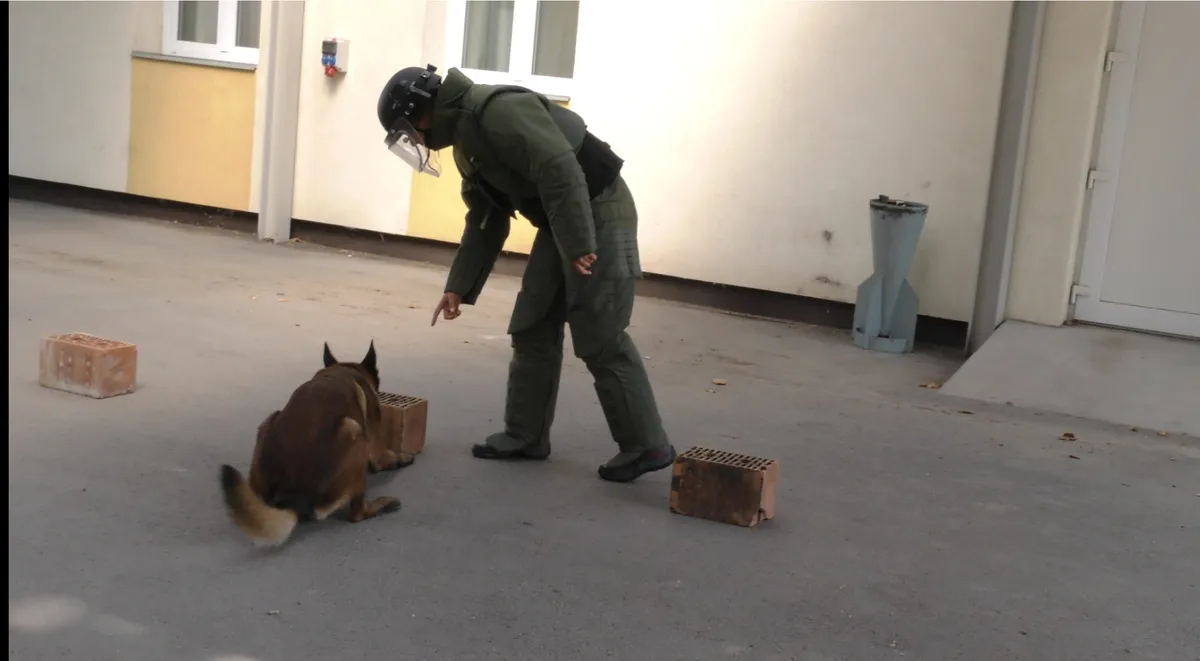 „A következő feladatnál azonban már önállónak kellett lennie: itt több blokktéglát tettünk le egymás mellé, és a kollégáim cserélgették a helyét annak, amibe robbanóanyagot tettek. Ez egy olyan gyakorlat volt, ahol beöltöztem védőfelszerelésbe, hiszen sok olyan veszélyes helyszín is van, ahol ez elengedhetetlen. A kutyának nehezebb, mert másképp hall és lát engem, így önállóbban kell dolgoznia, de ez is simán ment neki” – magyarázta a gyakorlatok kapcsán Zsófia, aki öt kutyával osztja meg az otthonát.