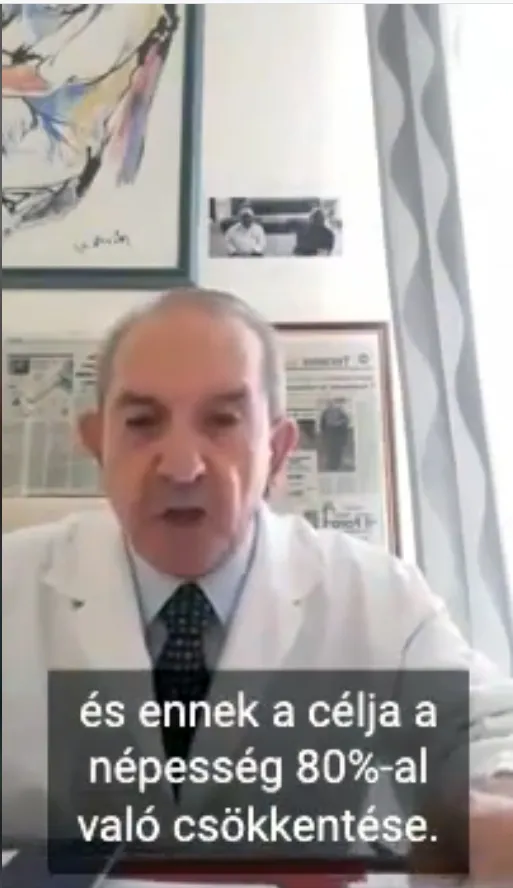 Dr. Roberto Petrelli videóban állítja: a Covid-19 egy terv, melynek célja a népesség 80 százalékának elpusztítása. Szerinte olyan vakcinákat adnak majd be, amitől betegek leszünk, miközben állítja, egészséges vírushordozók vagyunk. A tesztelések kapcsán megjegyzi, azok 90 százaléka pozitív lesz, hogy elhitessék az emberekkel, betegek. A cél, hogy mindenkit beoltsanak.