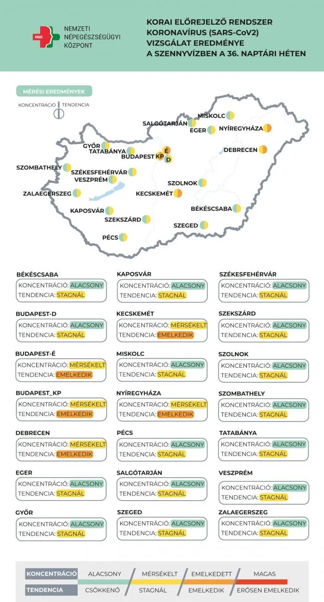 Nyíregyházán, Budapest észak és központi területein, Debrecenben növekedő tendenciát mutattak ki az új koronavírus örökítőanyagának mennyiségében a 36. héten végzett szennyvízvizsgálatok.