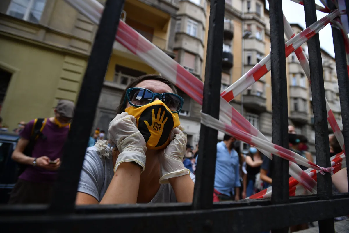 Résztvevõ a Színház- és Filmmûvészeti Egyetem (SZFE) Szentkirályi utcai épületénél az SZFE és a Parlament között szervezett élõláncon 2020. szeptember 6-án. Élõlánccal tiltakoztak az SZFE modellváltása, autonómiájának elveszítése ellen az intézmény hallgatói és szimpatizánsok ezen a napon Budapest belvárosában. Az élõlánc tagjai kézrõl kézre adták azt a chartát, amelyet délelõtt az egyetem szenátusa írt. A Charta Universitasban rögzítették azokat az alapelveket, amelyek mentén el tudnák képzelni az együttmûködést az Innovációs és Technológiai Minisztériummal.