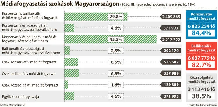 A magyar médiapiac kiegyensúlyozott: nagyságrendileg ugyanannyian tájékozódnak konzervatív, mint balliberális forrásokból, előbbi 84 százalékot, azaz 6,8 millió, utóbbi 83 százalékot, vagyis 6,7 millió embert jelent. Azok száma, akik egyaránt tájékozódnak mindkét oldal médiumaiból, majdnem hatmillió fő, azaz a választópolgárok legalább 75 százalékához garantáltan mindegyik politikai oldal nézete eljut.