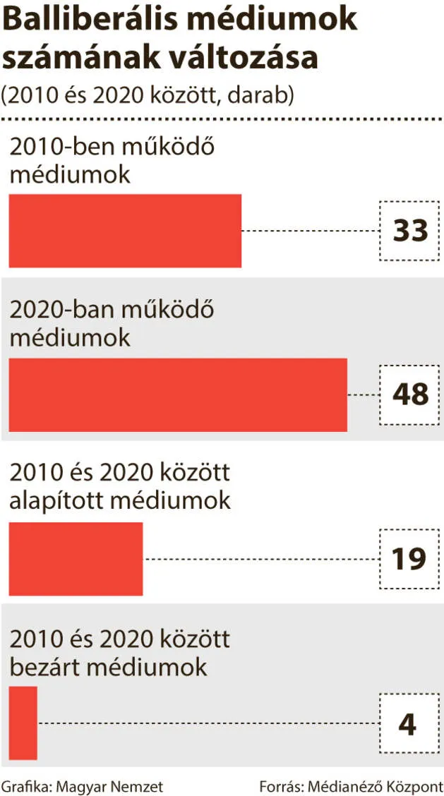 • 2010-ben 33 balliberális médium működött Magyarországon, 2020-ra 48-ra emelkedett a számuk: mindössze 4 ilyen médium szűnt meg, miközben 19 új jött létre.