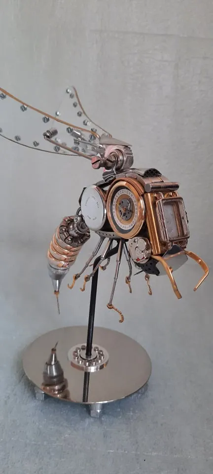 Miután elkészült a skorpió, annyi pozitív visszajelzést kaptam, hogy arra gondoltam, készítek egy újabb szobrot. Ám ezekhez alkatrészekre volt szükségem, így elkezdtem a barátaimtól, ismerőseimtől elromlott gépeket, órákat kérni, amiknek a szerkezetét fel tudom használni.