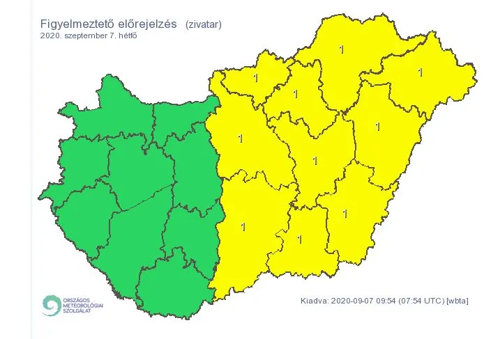 Elsőfokú, citromsárga riasztást adott ki zivatarok kialakulása miatt az Országos Meteorológiai Szolgálat. Az érintett területeken elsődleges veszélyforrást a villámlás jelent, emellett esetenként megerősödhet a szél, és jégeső is előfordulhat.