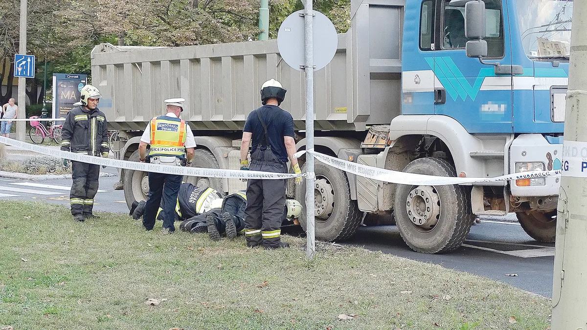 Tűzoltók és rendőr Szegeden, a Budapesti körúton, a Csillag téri körforgalomnál, ahol meghalt egy útra kiszaladó kisgyerek, akit elgázolt egy teherautó 2020. szeptember 7-én.