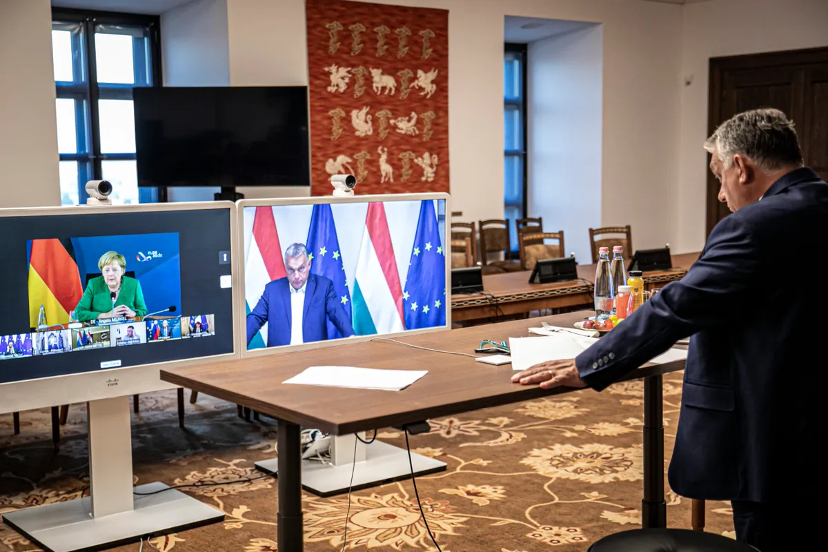 A Miniszterelnöki Sajtóiroda által közreadott képen Orbán Viktor kormányfõ a soron következõ uniós csúcstalálkozót elõkészítõ megbeszélést folytat Charles Michellel, az Európai Tanács elnökével, Angela Merkel német kancellárral, a ciprusi elnökkel, valamint az olasz, a szlovén, az észt és a luxemburgi miniszterelnökkel a Karmelita Kolostorban, videokonferencia keretében 2020. szeptember 9-én.