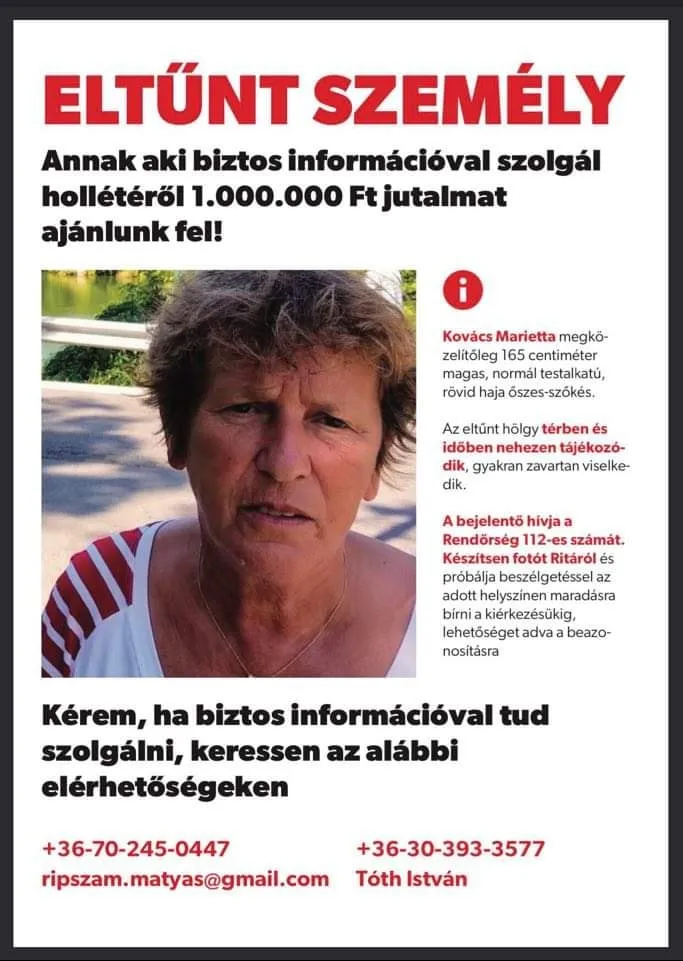 Végső elkeseredésükben 1 millió forint nyomravezetői díjat ajánlottak fel az egy hónappal ezelőtt eltűnt Kovács Marietta hozzátartozói annak, aki megtalálja az Alzheimer-kórban szenvedő nőt. Az asszony Miskolcon tűnt el, ahol párjával voltak éppen családlátogatáson.