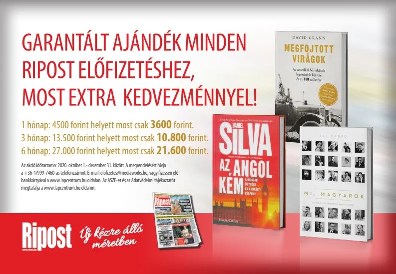 A megrendelésért hívd a +36-46/998-800-as telefonszámot! E-mail: [email protected], vagy fizessen elő bankkártyával a www.lapcentrum.hu/ripost oldalon.