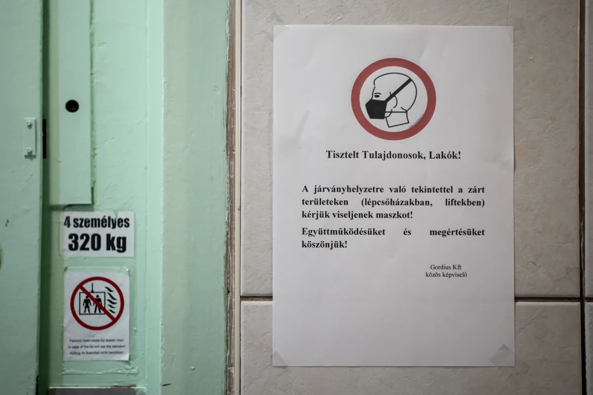 „Tisztelt Tulajdonosok, Lakók! A járványhelyzetre való tekintettel a zárt területeken (lépcsőházakban, liftekben), kérjük, viseljenek maszkot! Együttműködésüket és megértésüket köszönjük!” – olvasható egy újpalotai ház lépcsőházában, de ehhez hasonló felirat több társasház, lakótelepi panel bejáratán megjelent.