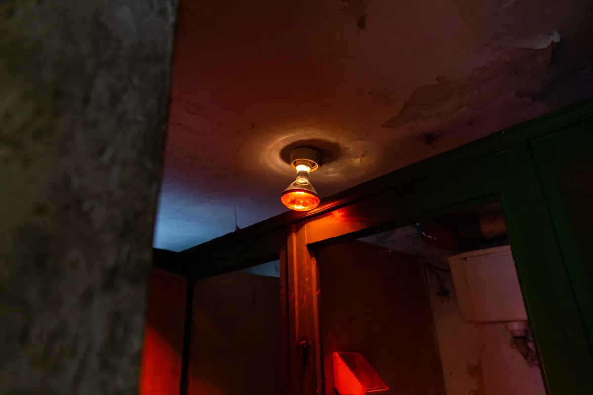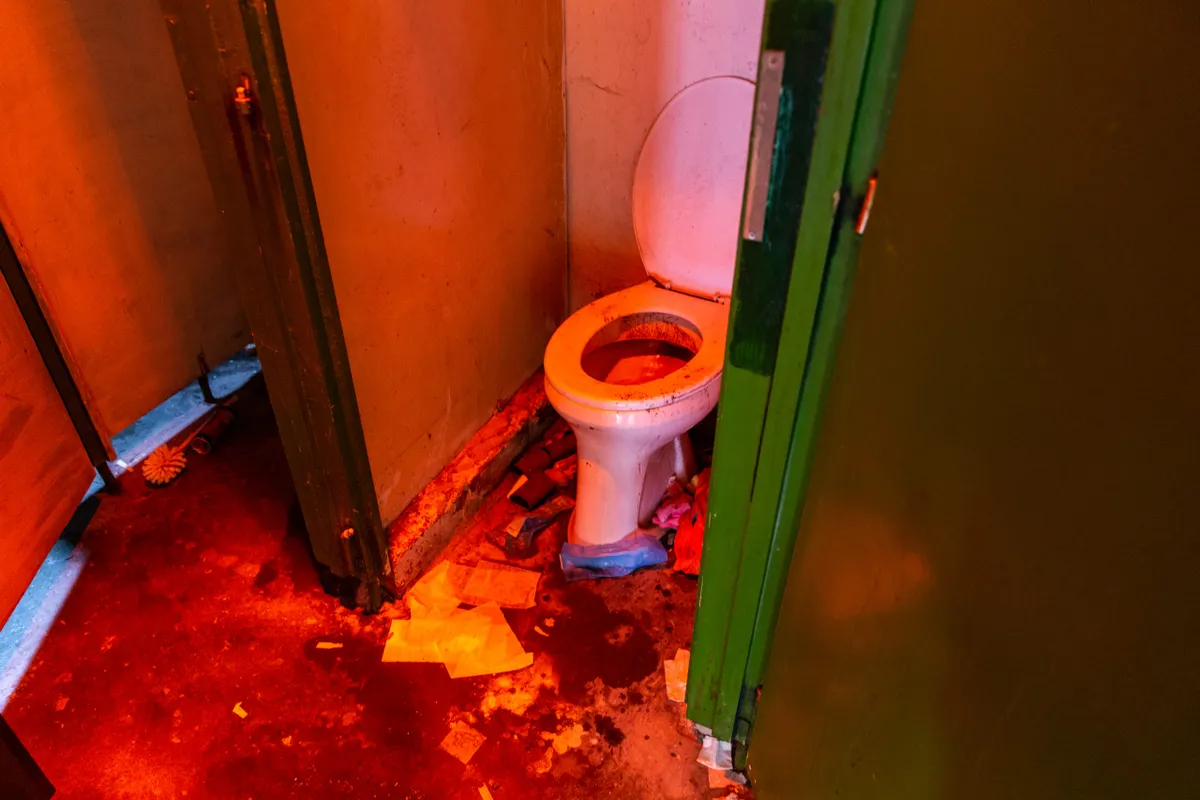 Az egykor szebb napokat látott házban még a folyosókon is vannak mellékhelyiségek, van víz, villany. Több emeleten folyamatosan folyt a víz a tartályokból, a felső emeleten pedig egy állandóan felkapcsolt, meleget adó infralámpa világította meg a mellékhelyiséget. Látszik, hogy melegedni is ide járnak.