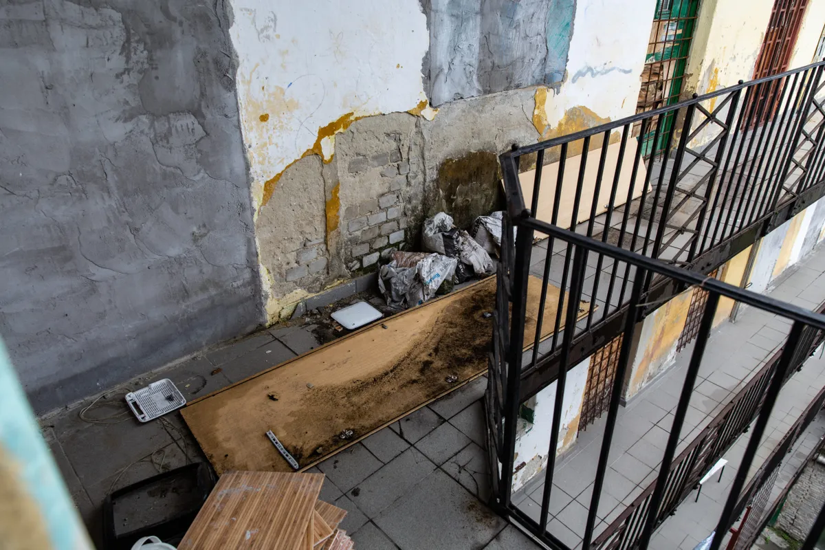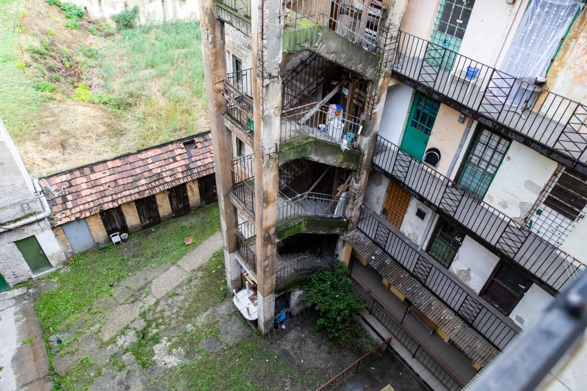 Fojtogató bűz, szeméthalmok fogadják az ide érkezőket. Az első ház legfelső emeletén hivatalosan már nem lakik senki, mégis egyes lakások ajtaja tárva-nyitva, a bennük felhalmozott szemét és a cigicsikkek arról tanúskodnak, hogy vannak, akik ott húzzák meg magukat.