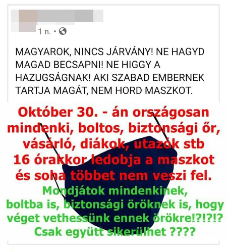 Nyilvánosan terjed az a felhívás, amiben a vírustagadók azt kérik, október 30-án pénteken mindenki dobja el a maszkot. Akkor, amikor az egész világon, így Magyarországon is napról napra több a koronavírus-fertőzött és emberek halnak meg a járványban! Ilyenkor csak az nem védekezik a vírus ellen, akinek öngyilkos hajlamai vannak.