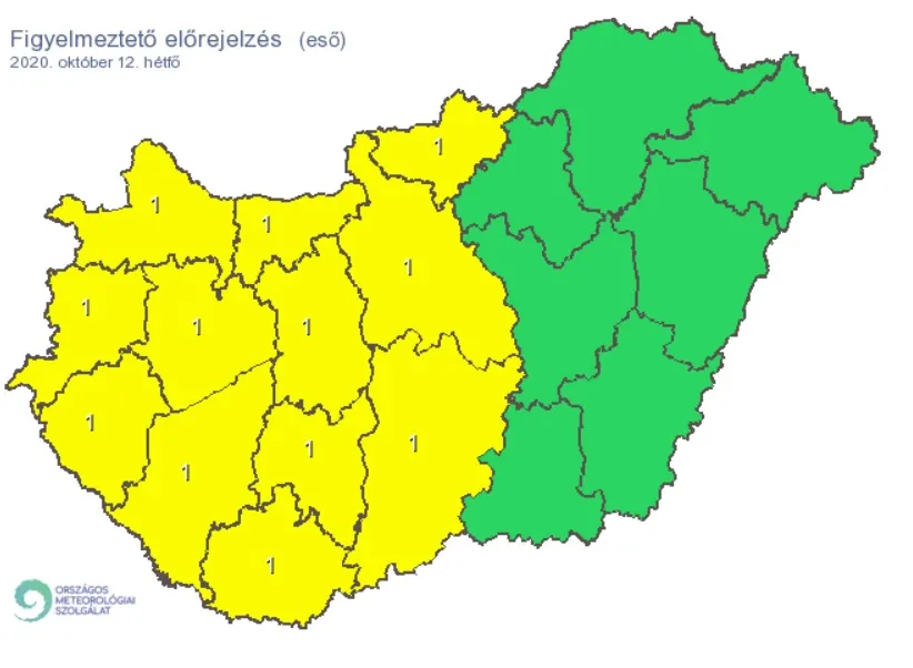 Tizenkét megyét érintő figyelmeztetést adott ki az OMSZ. Az ország nyugati részén 24 óra alatt több mint 20 mm csapadék hullhat, ami mellé helyenként 70 km/h-t meghaladó széllökések is társulhatnak.