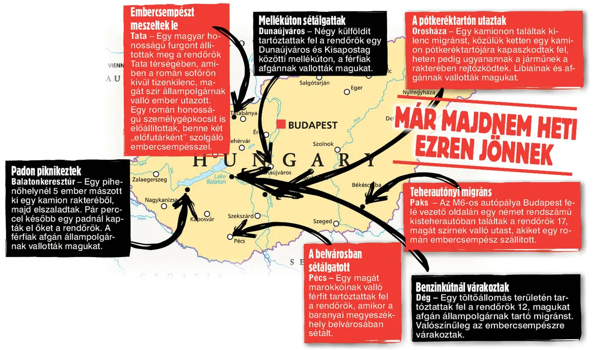 A 44. héten már 969 migránst tartóztattak fel Magyarország területén, akik illegálisan jutottak be hazánkba. Míg a legtöbb esetben már az illegális határátlépést követő percekben sikerül elkapni őket, vagy akár meg is akadályozni a határátlépést, most az embercsempészek miatt egyre többen jutnak be az ország belsejébe is, ahol a legkülönfélébb helyeken csapnak le rájuk a rendőrök. A magukat általában szír, afgán, vagy marokkói állampolgárságúnak valló férfiak egy esetben se tudták sem személyazonosságukat, sem magyarországi tartózkodásuk jogszerűségét hitelt érdemlően igazolni.