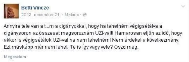 „Annyira tele van a t...m a cigányokkal, hogy ha tehetném, végigsétálva a cigánysoron az összeset megsoroznám UZI-val. Hamarosan eljön az idő, hogy akkor is végigsétálok UZI-val, ha nem tehetném! Nem érdekel a következmény. Ezt másképp már nem lehet” – írta.