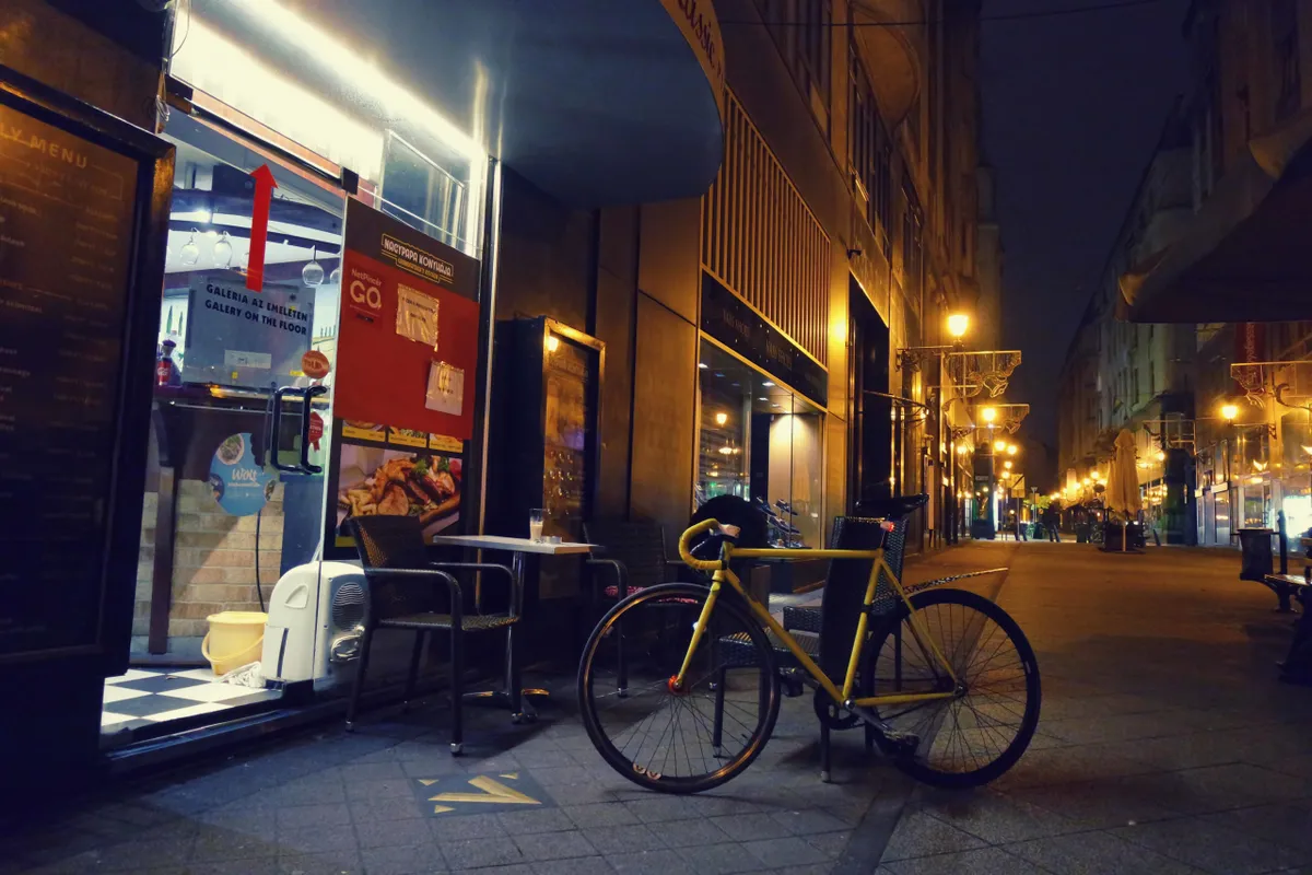 Csak a biciklifutárok várakoznak az éttermek előtt a Haris közben, este 9-kor hajnali hangulat van.