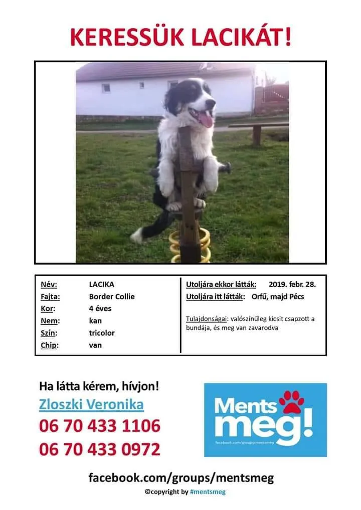 Lacikát mindenki ismerte a Pécs melletti településen, ahol négyéves koráig boldogan élt. A border collie szerelmes volt, gyakran járt udvarolni pár házzal arrébb, így amikor először észrevették gazdái, hogy nincs otthon, nem aggódtak. De miután leinformálták a szuka tulajdonosát, már belopódzott szívükbe a félelem. Ez közel két éve volt.