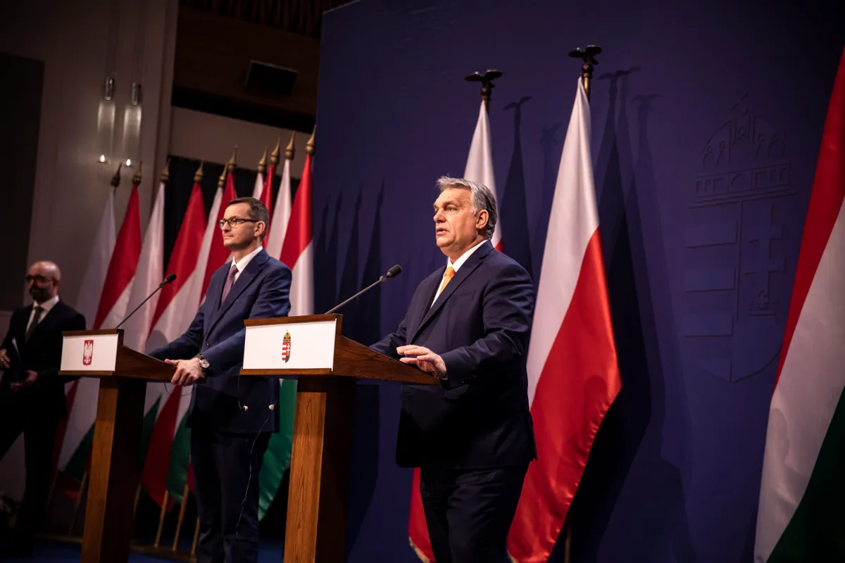 A Miniszterelnöki Sajtóiroda által közreadott képen Orbán Viktor magyar (j) és Mateusz Morawiecki lengyel kormányfõ sajtótájékoztatót tart a Karmelita kolostorban 2020. november 26-án. Tárgyalásuk napirendjén az EU költségvetésének ügye szerepelt, ami ellen Magyarország és Lengyelország is vétót emelt amiatt, hogy az uniós pénzek felhasználását Brüsszel politikai feltételekhez akarja kötni.
