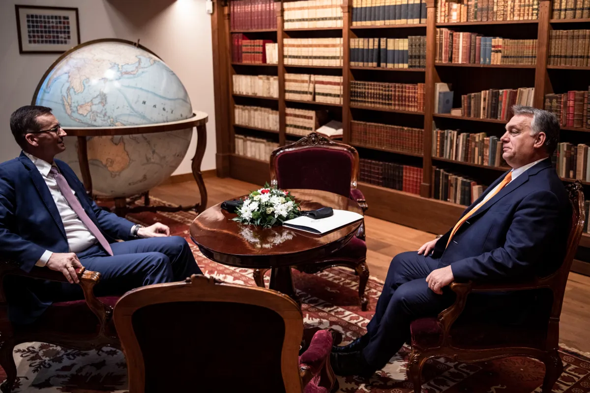 A Miniszterelnöki Sajtóiroda által közreadott képen Mateusz Morawiecki lengyel (b) és Orbán Viktor magyar kormányfõ tárgyal a Karmelita kolostorban 2020. november 26-án. Tárgyalásuk napirendjén az EU költségvetésének ügye szerepelt, ami ellen Magyarország és Lengyelország is vétót emelt amiatt, hogy az uniós pénzek felhasználását Brüsszel politikai feltételekhez akarja kötni.