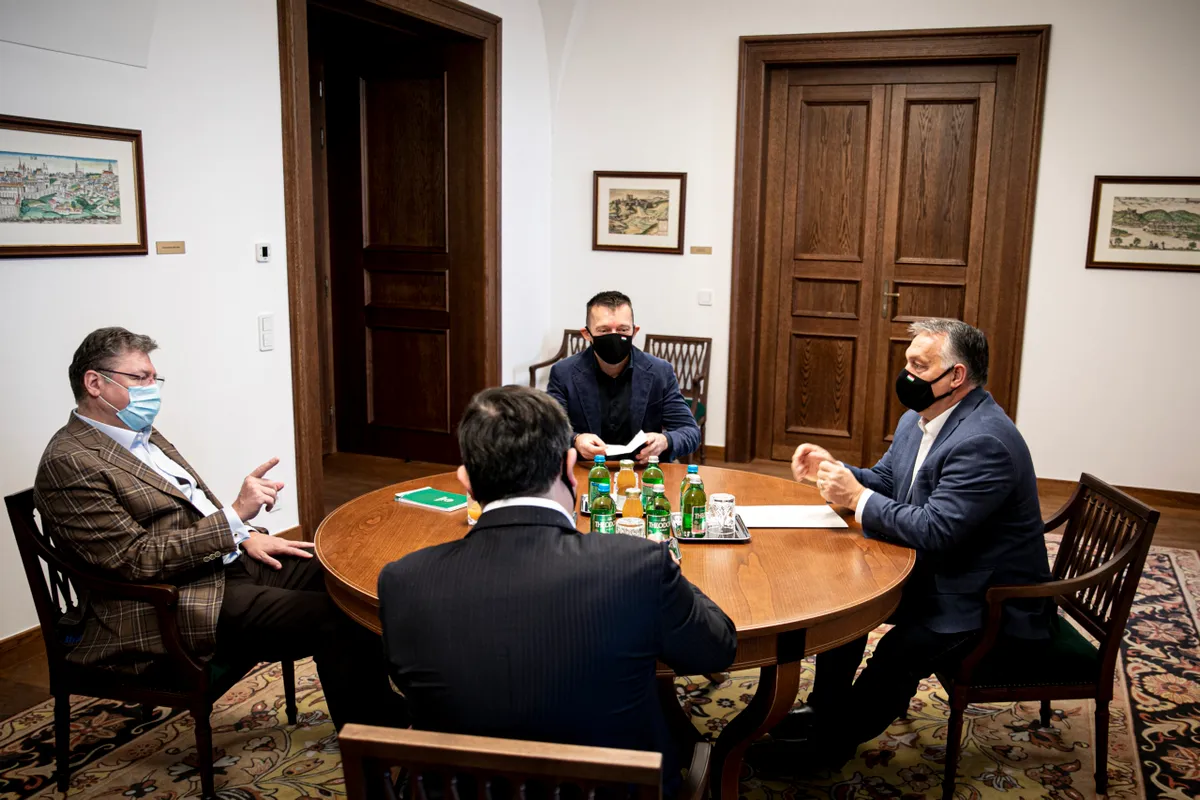 A Miniszterelnöki Sajtóiroda által közreadott képen Orbán Viktor miniszterelnök (j) Parragh Lászlóval, a Magyar Kereskedelmi és Iparkamara (MKIK) elnökével (b) tanácskozik a Karmelita kolostorban 2020. november 8-án. Szemben Rogán Antal, a Miniszterelnöki Kabinetirodát vezetõ miniszter (k), háttal Nagy Márton miniszterelnöki megbízott, gazdaságpolitikai tanácsadó.