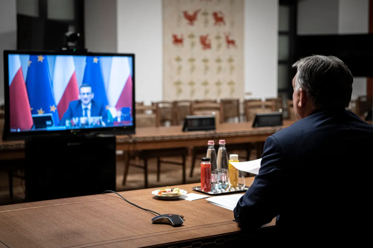 A Miniszterelnöki Sajtóiroda által közreadott képeken Orbán Viktor miniszterelnök videókonferencián egyeztetett a visegrádi partnerekkel (V4) az EU-csúcs előtt.